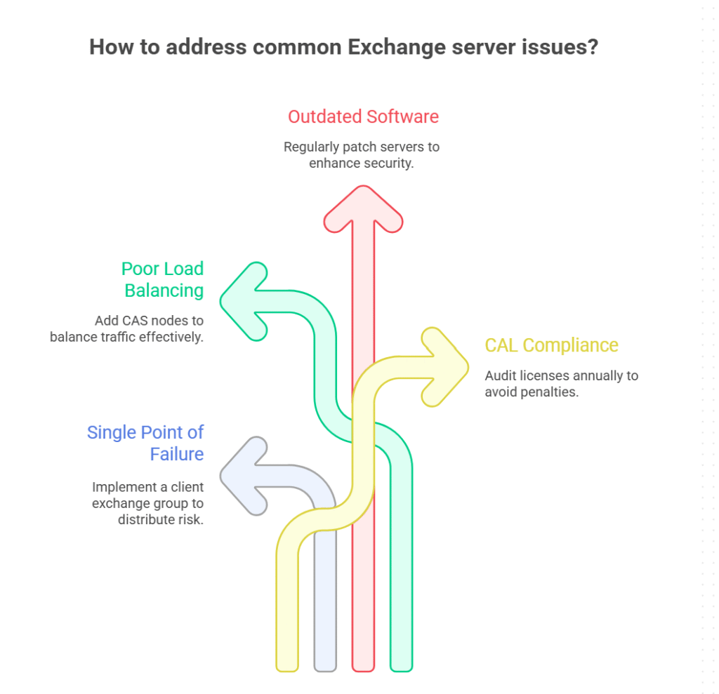 3. Outdated Software: Regularly patch your Exchange servers (security vulnerabilities).