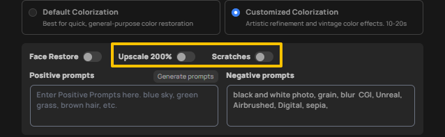 For most users, Default Colorization delivers excellent results right out of the box. If you choose Customized Colorization, click “Generate Prompts” in the “Positive Prompts” section. The AI will automatically generate descriptive prompts based on your image, but you can edit these to better match your vision.