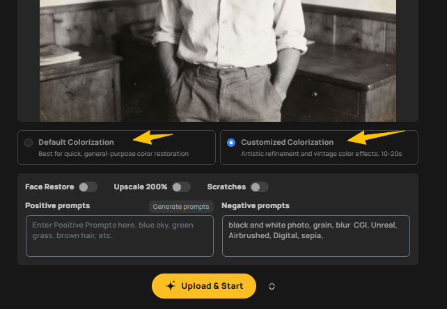 Select the options that best suit your photo’s condition, then click “Upload & Start” to begin the colorization process.