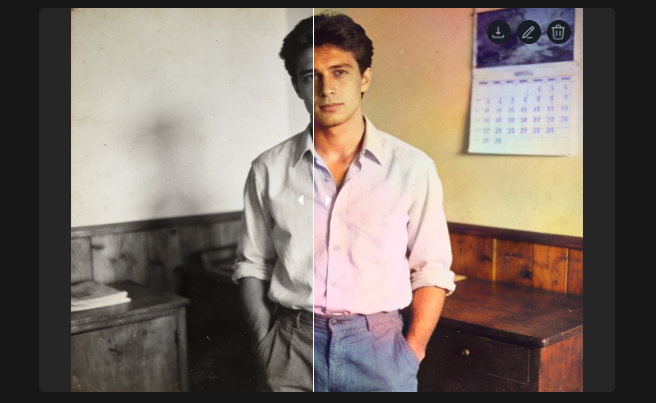 To save your colorized photo, click the download icon in the top-right corner of the image. If you’d like to make additional adjustments, click the pencil icon to access editing tools for rotation, cropping, filters, and text overlays. When satisfied with your edits, click “Done” to finalize and save your changes.