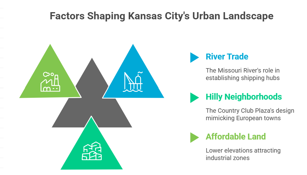 - River Trade: Flat areas near the Missouri River became shipping hubs (KC’s nickname: “Crossroads”).