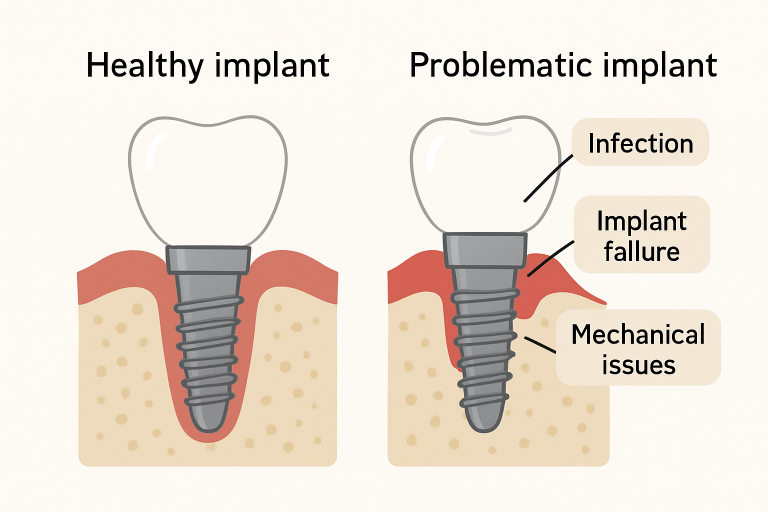 Implants have an excellent safety record, yet certain complications remain possible. Among the most frequently encountered risks: