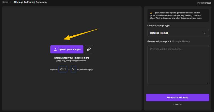 Visit Vheer’s AI image prompt generator and upload your reference image. You can: