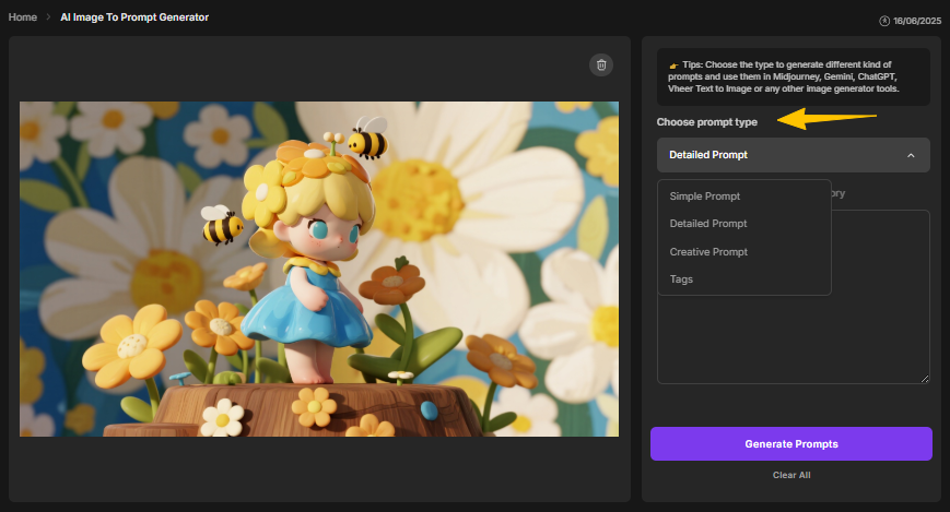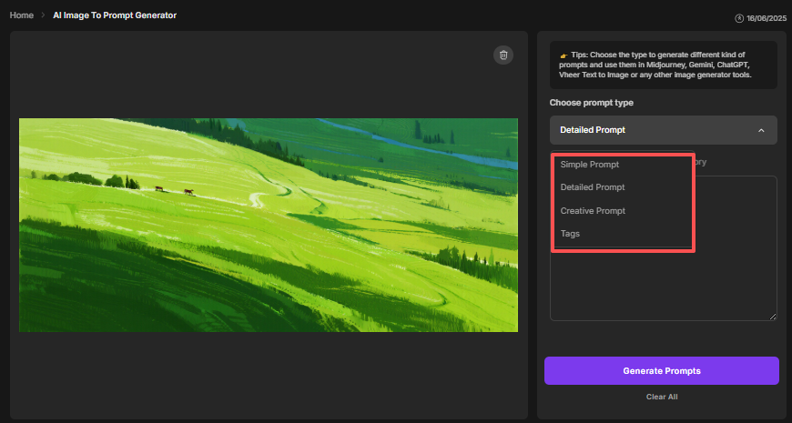 - The Detailed Prompt goes deeper by capturing lighting, textures, composition, colors, and background elements, helping you recreate an image as accurately as possible.